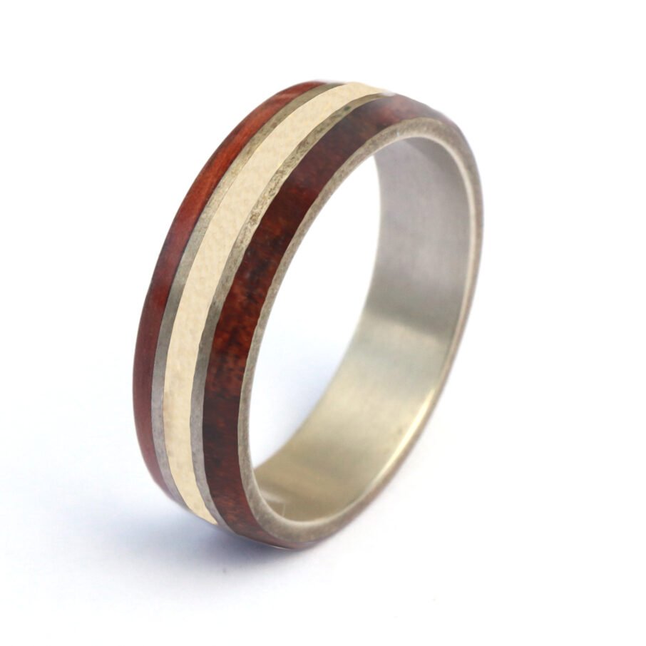 Our wooden rings are remarkably sturdy, thanks to bent wood technique. While they resist breaking, they may show scratches more readily than metal rings. A simple re-coating and polishing restore their smooth appearance. While our rings are coated with a waterproof layer, prolonged exposure to water can shorten their lifespan. It’s best to remove them for extended water activities and before a shower. An occasional rinse under a shower and everyday handwashing is OK.